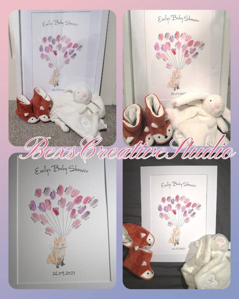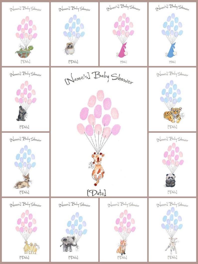 Choose from 13 water colour designs, originally painted by me, then turned into cute little animal or baby prints to hold your fingerprint balloons.